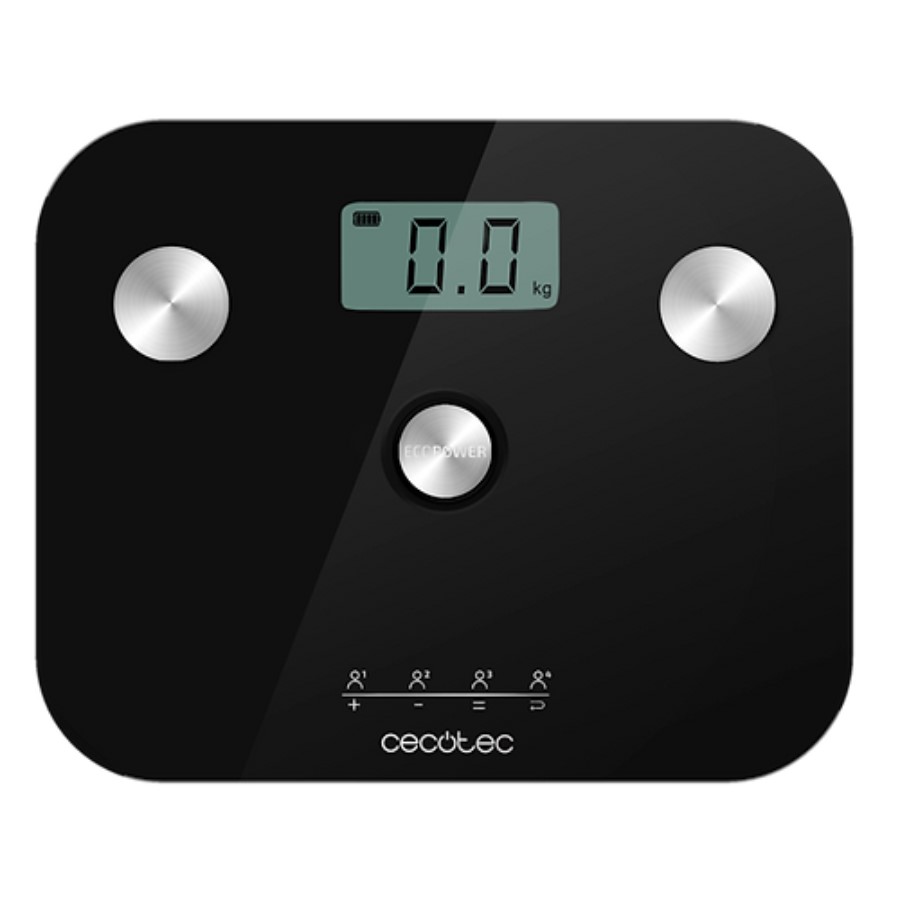 The Cecotec Surface Precision EcoPower 10100 bathroom scale —Powered entirely by a kinetic push-button, no batteries required. Featuring high-precision sensors and tempered glass, it accurately measures from 8 kg to 180 kg in 100 g increments and provides full body composition analysis—weight, body fat, muscle mass, bone mass, water percentage, and BMI—for up to four users. The extra-thin design with a large LCD screen delivers clear, immediate readings, while auto-on/off, overload alerts, and non-slip TPU feet ensure safe, user-friendly operation.
