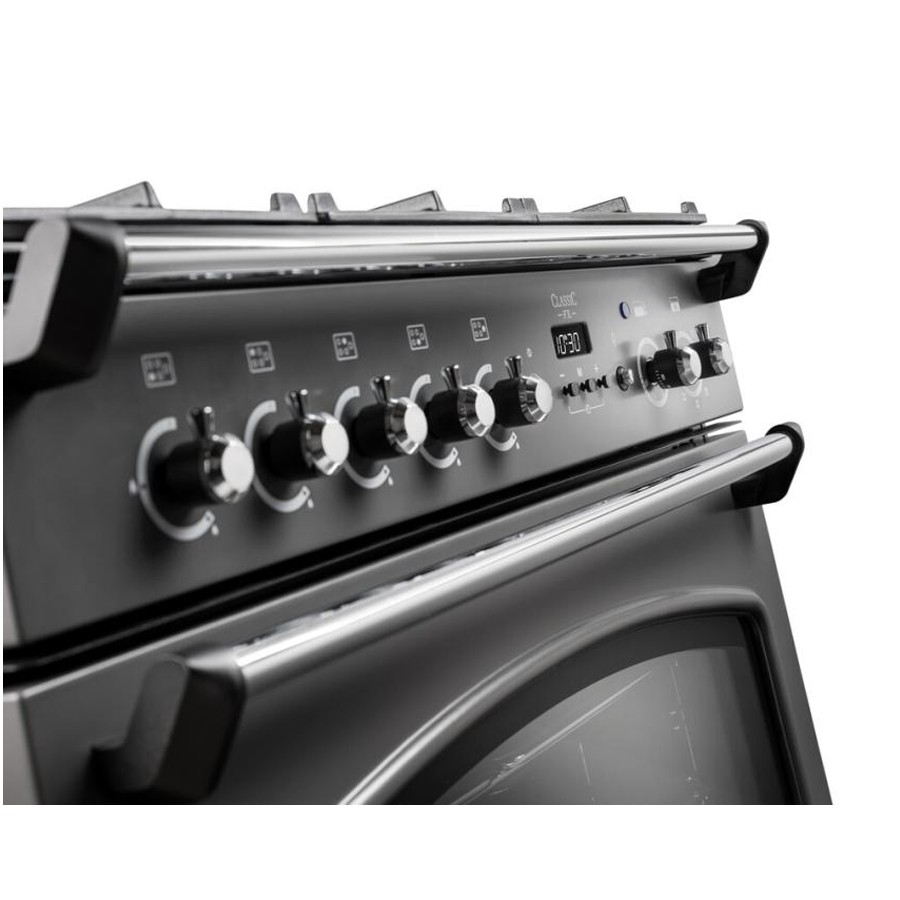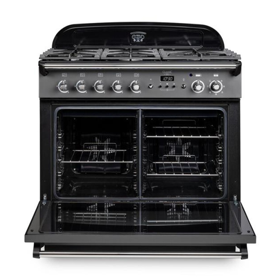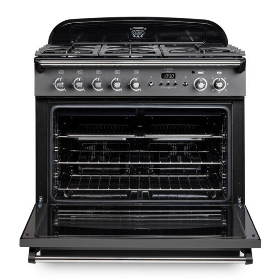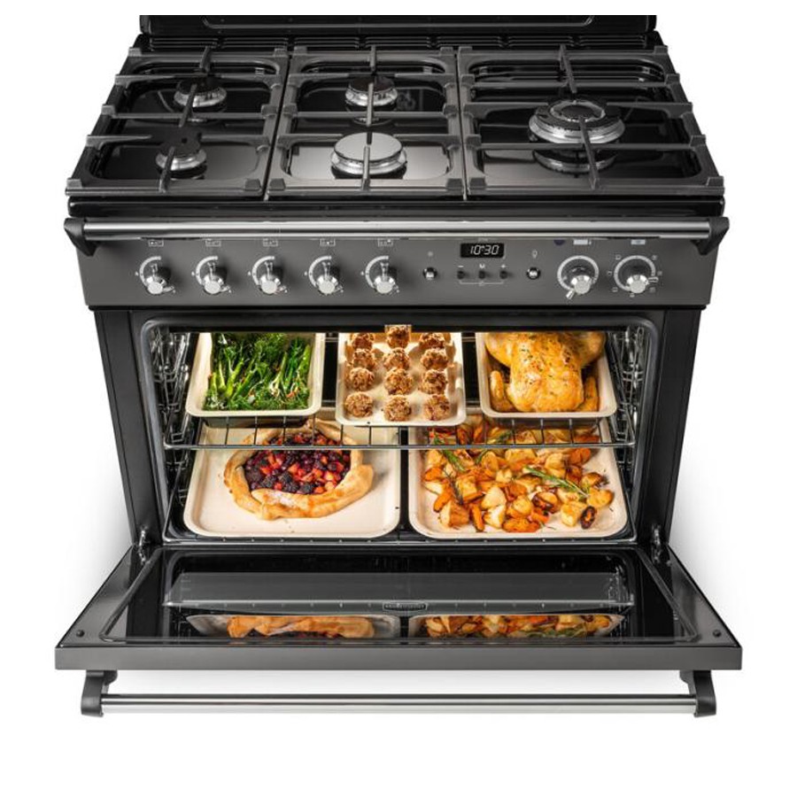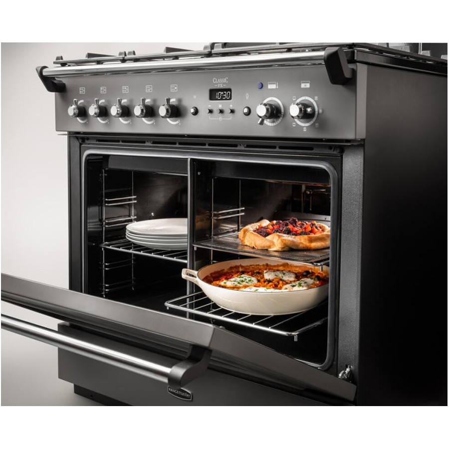 Elevate your culinary space with the Rangemaster Classic FX 90cm Dual Fuel Range Cooker in Black with Brass trim (model CLAS90FXDFFBL/B). Blending timeless design with modern functionality, this range cooker features a spacious 114-litre multifunction oven offering seven versatile cooking modes. The innovative Energy Saving Panel allows you to divide the oven cavity, optimizing energy use for smaller meals while transforming the unused section into a convenient plate warmer.