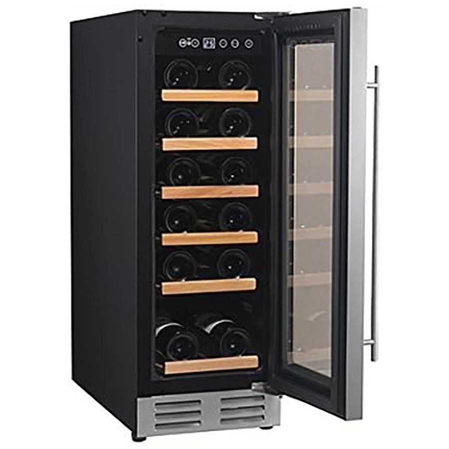 The Climadiff CLE18 is a premium built-in wine cellar, perfect for seamlessly integrating into your kitchen or bar while keeping up to 18 bottles at their ideal temperature. With an adjustable range of 5-22°C, it provides optimal conditions for all wine types, from reds to whites. Its stainless steel frame, double-glazed UV-protected glass door, and sleek black interior offer both style and protection. Featuring six fixed wooden shelves, electronic temperature control, and blue LED lighting, this cellar combines elegance with advanced technology.