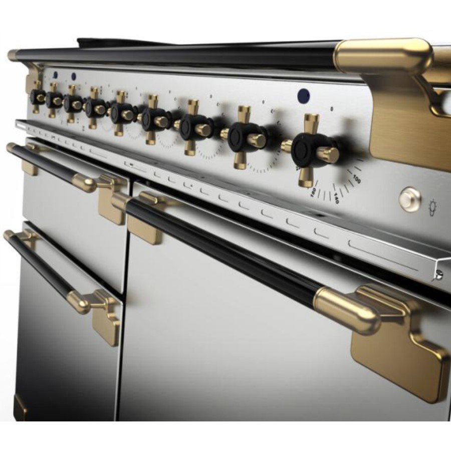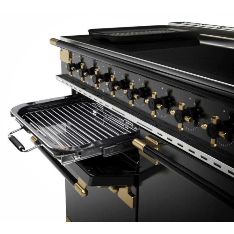 With a high-quality French feel, the special edition Elise Luxe featuring a stylish Antique Brass trim has the aesthetic appeal of a professional-looking appliance and is ideal for home cooks and novice chefs alike. Stylish Antique Brass trim, black handles and two-tone cruciform dials with knurled finish, 79 litre Multifunction oven, Handyrack, Accompanying Fan oven, Dedicated Deluxe Glide-out Grill with 4-way trivet, Storage drawer (110cm).