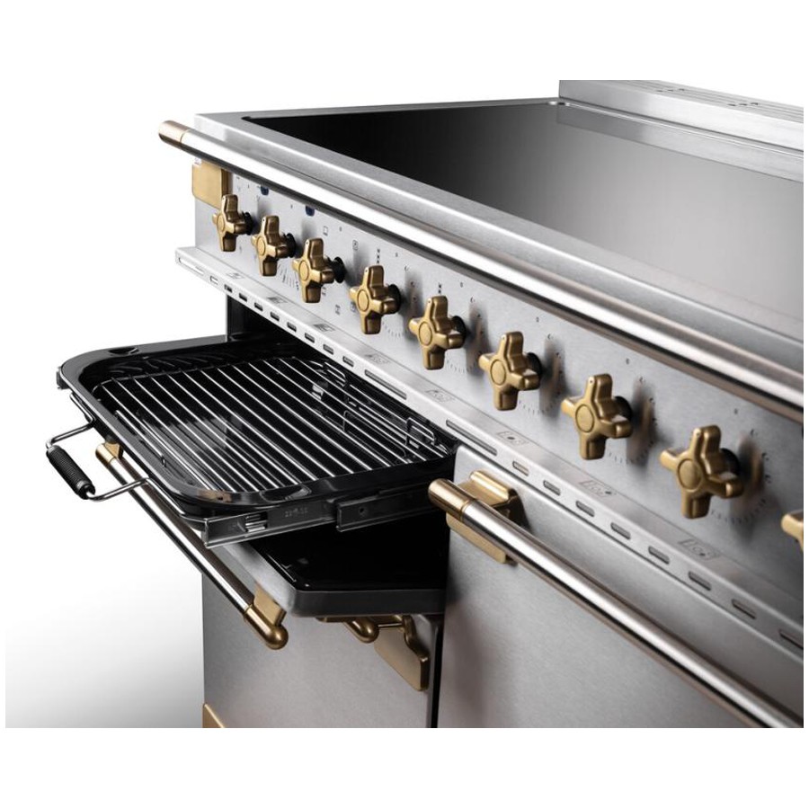 Introducing the Rangemaster Elise Luxe 110 ELS110EISS/AB — a stunning 110 cm induction range cooker finished in stainless steel with elegant antique brass accents. It features a 5-zone induction hob (total output up to 7.4 kW with boost functions), delivering fast, efficient heat control. The double-oven setup includes a multifunction main electric fan oven and a second fan oven, complemented by a 2.3 kW dual-circuit glide-out grill for flexible roasting and grilling.
