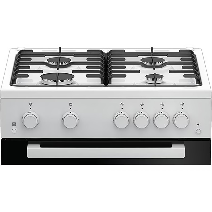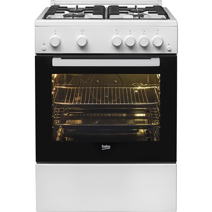 Perfectly suited for bustling households, the Beko FBGT62110GWO is a freestanding 60 cm gas cooker in classic white, offering four high-efficiency burners that boil up to 50% faster and reduce gas consumption Cooking is safer thanks to the flame failure device, which cuts the gas supply instantly if a flame goes out while electric ignition ensures effortless start-up. The spacious 72 L oven features a built-in halogen lamp and mechanical timer, plus versatile cooking modes including gas grill and rotisserie to deliver juicy, golden results every time. Available with a sturdy enamel tray and wire shelf, easy-clean enamel interior, and backed by a 5 year guarantee with registration, this reliable cooker brings powerful performance, enhanced safety, and everyday convenience to modern kitchens.