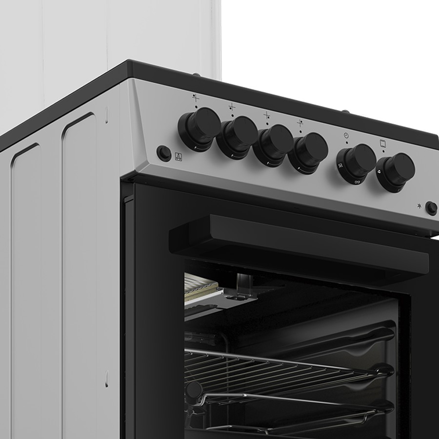 Upgrade your kitchen with the Beko FSGT52110DXON gas cooker a stylish 50 cm 4-burner unit in sleek stainless steel that brings efficiency and safety to every dish. High-efficiency gas burners heat quickly and evenly, while integrated electric ignition and a mechanical timer simplify prep and cooking. The oven features halogen lighting for easy monitoring and a rotisserie for perfect roasting at home. Flame-failure safety automatically cuts gas supply if a burner goes out, and the CleanZone glass door coating makes cleanup effortless. With a 55 L oven capacity, LPG conversion option, handy storage drawer, and elegant dimensions of 85 × 50 × 60 cm, this reliable cooker is a compact powerhouse for your home.