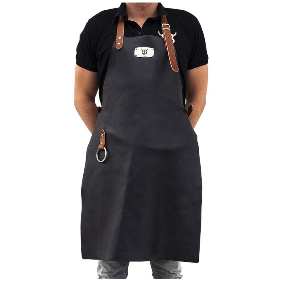 High-quality barbecue apron handmade from genuine leather. The specially developed leather is resistant to all types of stains such as grease or oil and is therefore ideal as protection when grilling. A metal ring is attached to the front, for example to hang up a towel or other grilling accessories. The apron is easy to wipe and clean with a slightly damp cloth.