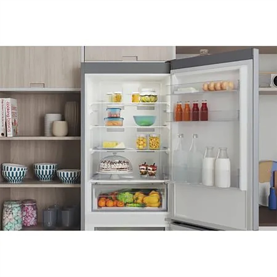 This Indesit Combi Fridge Freezer is a spacious, energy-efficient solution for keeping your food fresh and organized. With a generous fridge and freezer compartment, this combi unit provides ample storage for all your essentials, while the adjustable shelves and drawers allow for flexible organization. The sleek inox design complements any kitchen, and frost-free technology means no more manual defrosting.