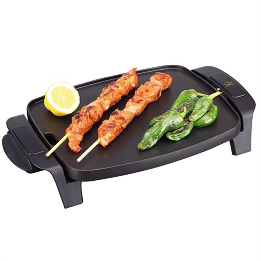The Jata GR205 electric roasting griddle features a durable Durastone non-stick surface that resists scratches and cleans easily. The cooking area measures 28 x 22 cm and includes a removable thermostat for precise temperature control. Cool-touch handles, a built-in sauce tray, and a dishwasher-safe design make it both safe and practical for everyday use. Powered at 1,000 W and crafted in Spain, this griddle brings effortless grilling right into your kitchen.