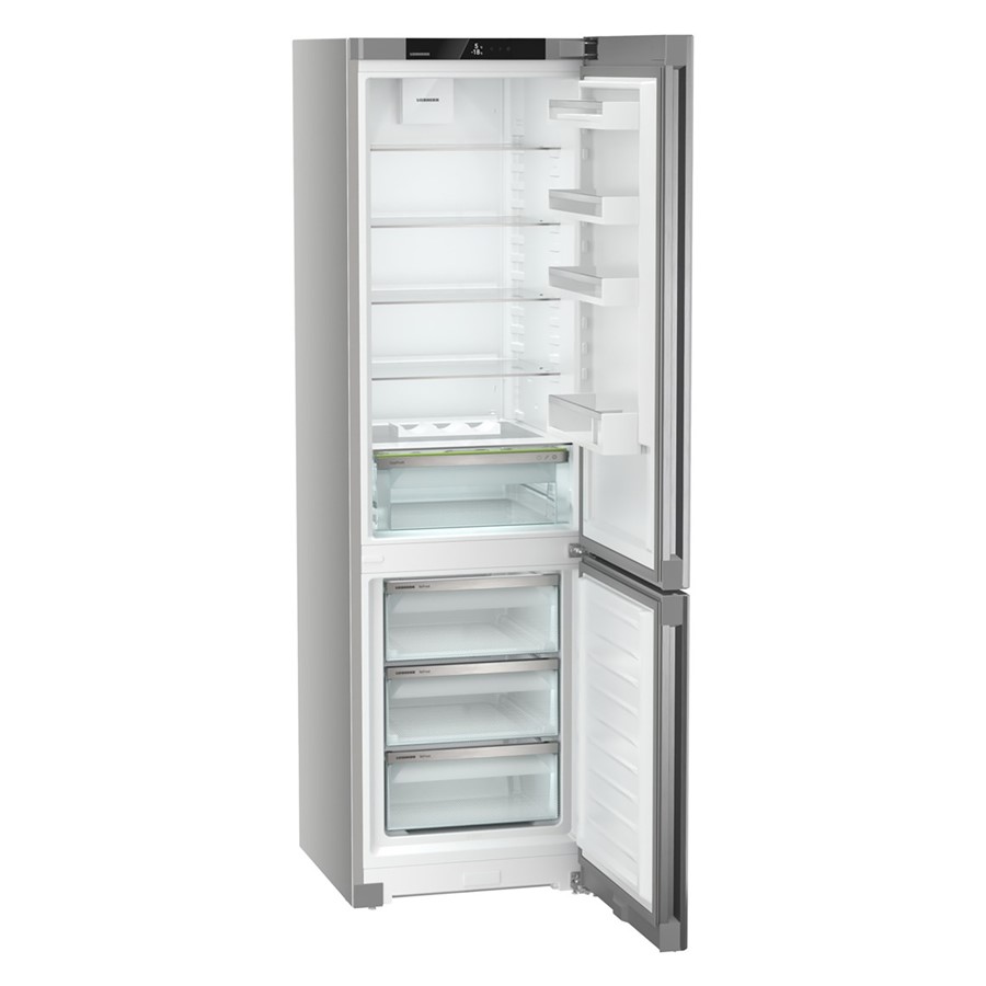 The Liebherr Fridge Freezer is a highly efficient and well-designed appliance that offers both performance and practicality. With a total capacity of 371 liters (268L for the fridge and 103L for the freezer), it provides ample storage space within a compact 60 cm wide frame, making it suitable for most kitchens. One of its standout features is DuoCooling, which uses two separate cooling circuits to prevent the transfer of air between the fridge and freezer. This keeps food fresher longer without mixing odors. The NoFrost system ensures the freezer remains frost-free, eliminating the need for manual defrosting. The fridge includes EasyFresh technology, which maintains an optimal humidity level to preserve the freshness of unpackaged fruits and vegetables. It also has a SuperCool and SuperFrost function, helping to rapidly cool or freeze newly added items to retain their nutritional value. Despite its strong cooling capabilities, the appliance is energy-efficient, rated D, and operates at a quiet 36 dB, making it barely noticeable in most home settings. Additionally, it comes with a touch display for easy temperature control and can be retrofitted with a SmartDeviceBox for smart home integration. Overall, the Liebherr is ideal for those looking for a spacious, feature-packed, and low-maintenance fridge freezer.