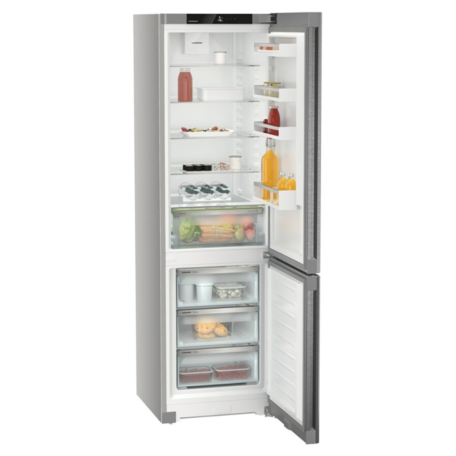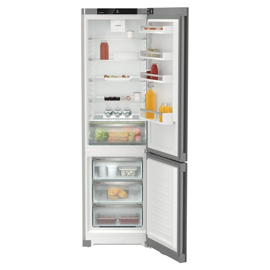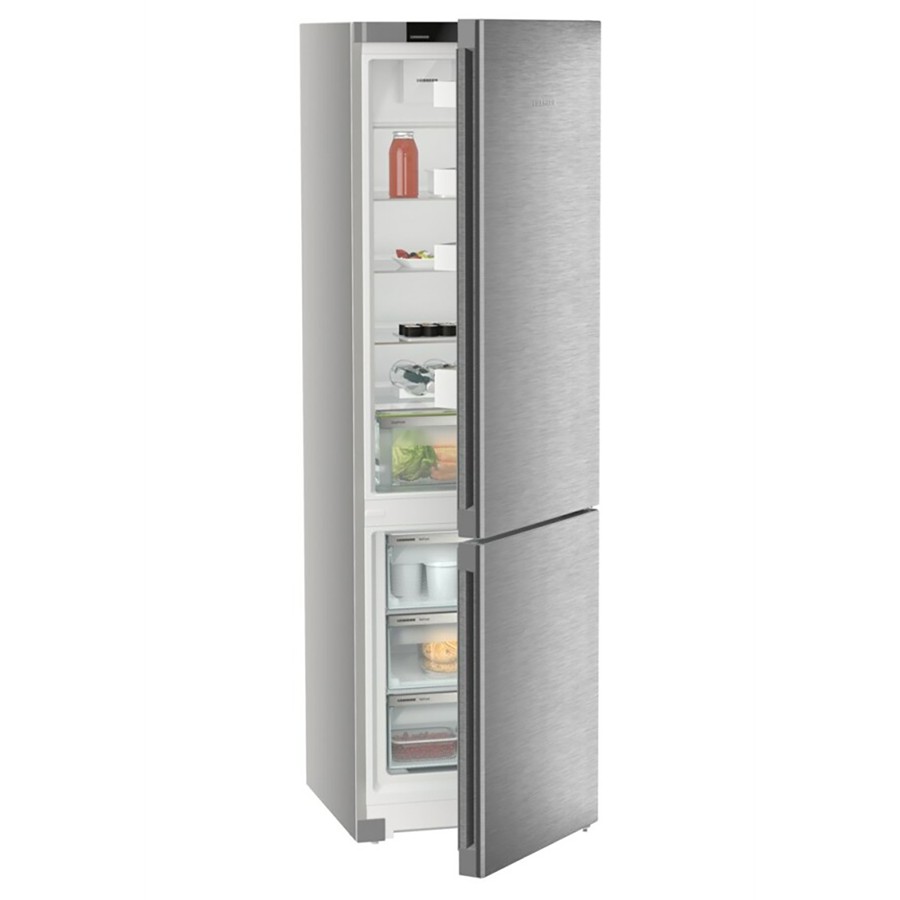 Discover the Liebherr CNsdc 5703 Pure NoFrost, a sleek freestanding fridge-freezer with smart features and refined design. Standing at 201.5 cm tall and 60 cm wide, it offers a generous 371 L capacity with a spacious 268 L fridge and a 103 L bottom freezer. It simplifies your life with EasyFresh humidity-controlled drawers, maintains frost-free convenience, and uses DuoCooling to keep aromas separate between compartments. The insulated steel exterior resists fingerprints, while a touch-display interface keeps control intuitive and seamless. At just 35 dB of noise, this energy-efficient (class C) appliance is both stylish and whisper-quiet—ready for smart home upgrades with the optional connectivity module.