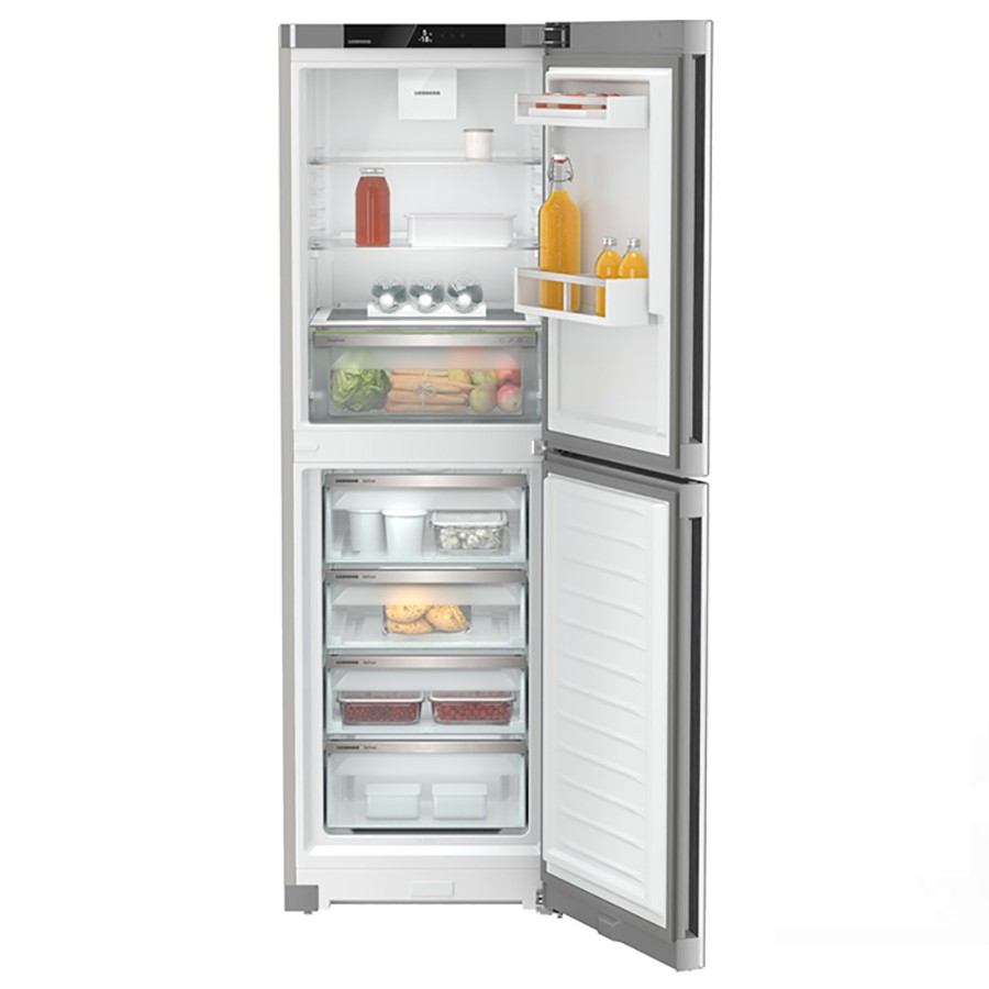 Experience advanced food preservation with the Liebherr KGNsff 52Z04 freestanding fridge-freezer, designed to keep your groceries fresher for longer. Featuring DuoCooling technology, it utilizes two separate cooling circuits to prevent air exchange between the fridge and freezer compartments, ensuring optimal humidity levels and preventing odor transfer. The EasyFresh drawer maintains the ideal environment for fruits and vegetables, while NoFrost technology eliminates the need for manual defrosting by preventing ice buildup. With a total capacity of 319 liters (187 liters for refrigeration and 132 liters for freezing), this appliance offers ample storage space. The intuitive touch display allows for easy temperature control and access to functions like SuperCool and SuperFrost. Its sleek SteelFinish design and reversible doors make it a stylish and adaptable addition to any kitchen.