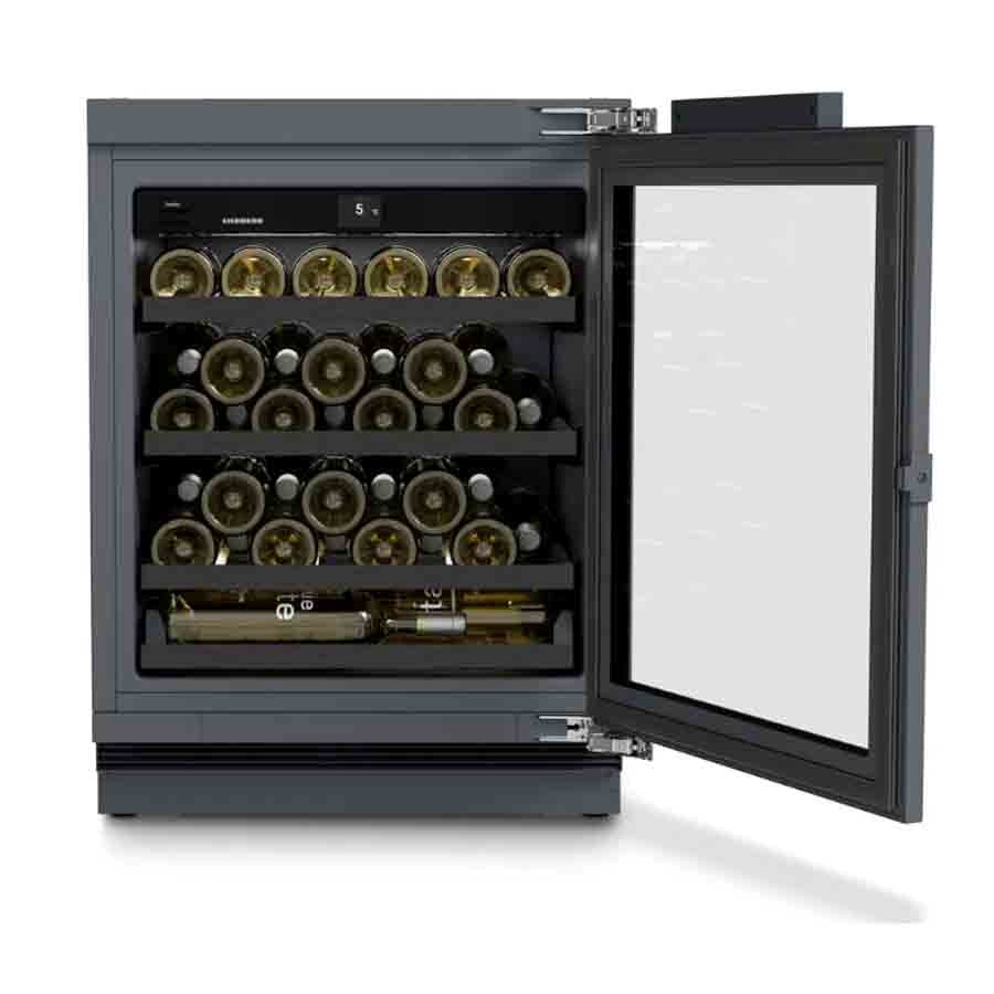 Designed for discerning wine lovers, the Liebherr UWpri 3661 Vinidor Selection is a premium under-counter wine fridge built to store up to 44 Bordeaux bottles in elegantly controlled conditions. Its Touch & Swipe color display lets you effortlessly adjust temperature, humidity, and lighting, while advanced features like TempProtect Plus, HumiditySelect, and UVProtect safeguard your collection against temperature fluctuations, dry corks, and harmful light. The VibrateSafe technology ensures delicate settling with a low-noise compressor (just 34 dB) and solid beech shelves, while its integration-ready design, LED illumination, and app-compatible SmartDeviceBox connectivity deliver both convenience and class.