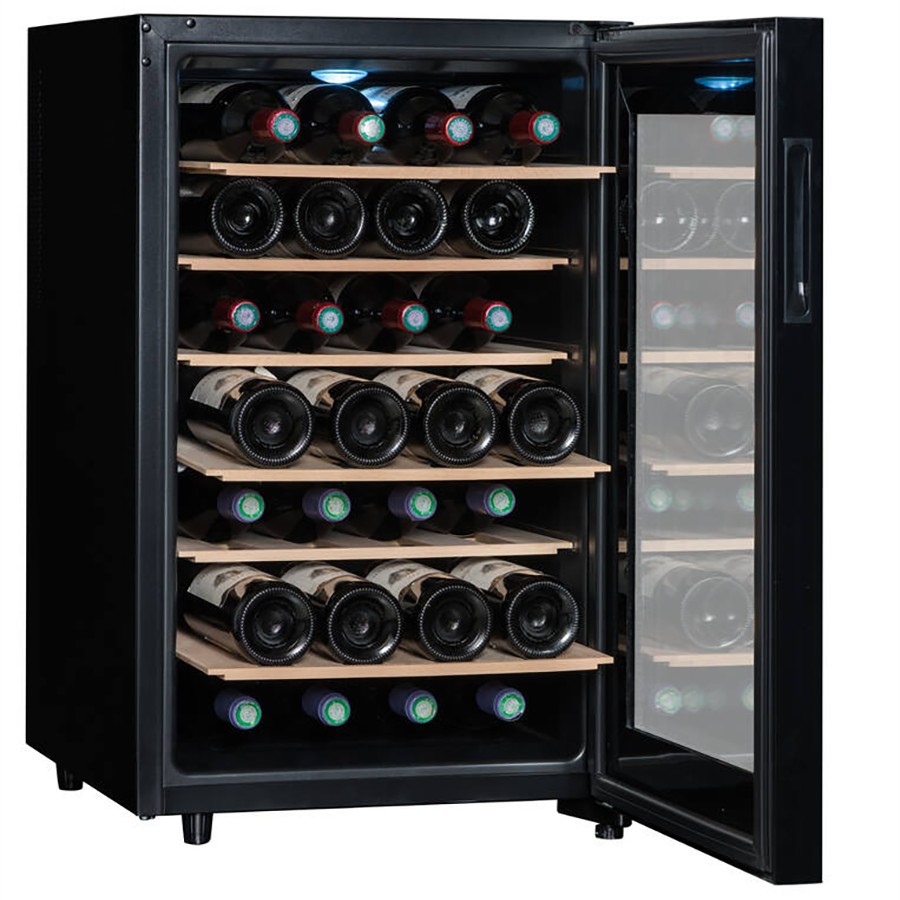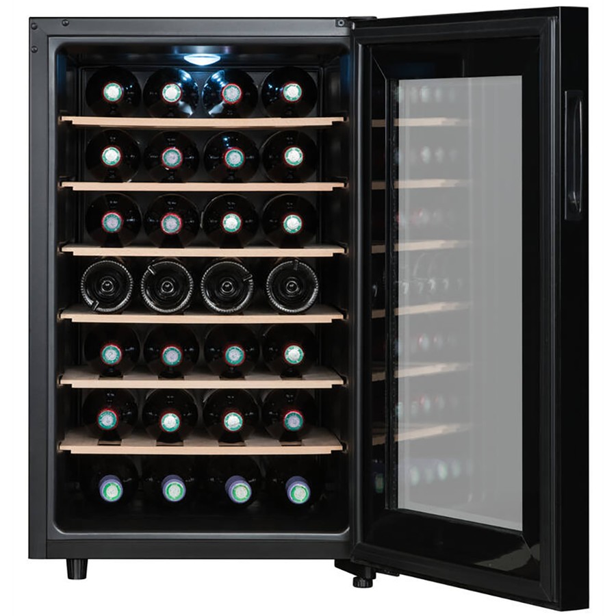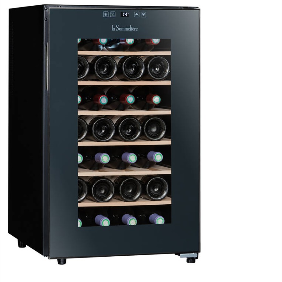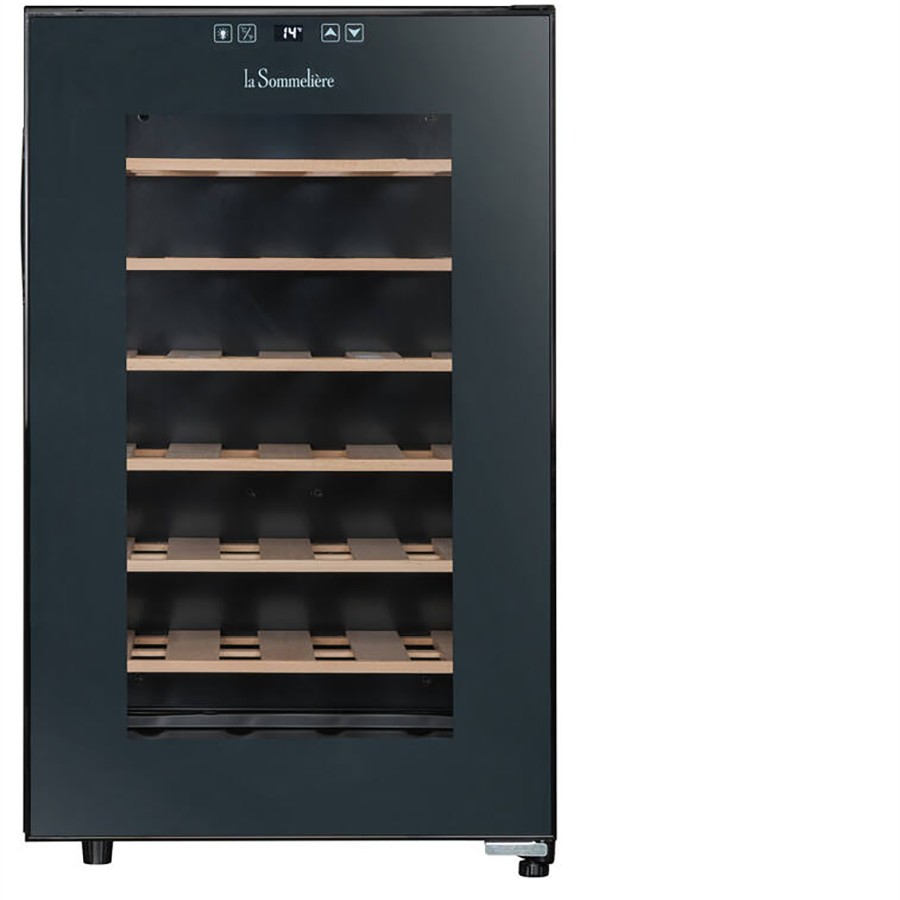 The Le Sommelière LS28CB is a sleek and freestanding service wine cellar, perfect for maintaining your wines at the ideal serving temperature. With a 28-bottle capacity, this stylish black unit is designed to accommodate all bottle types, ensuring versatility for any wine enthusiast. Its single-zone cooling system (11-18°C) provides optimal conditions for red and white wines, while the modern design, anti-UV glass door, and internal LED lighting add both protection and elegance. Ideal for placement in the living or dining room, this compact yet efficient wine cellar is a perfect addition for those who appreciate both functionality and aesthetics in their wine storage.