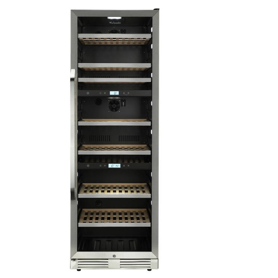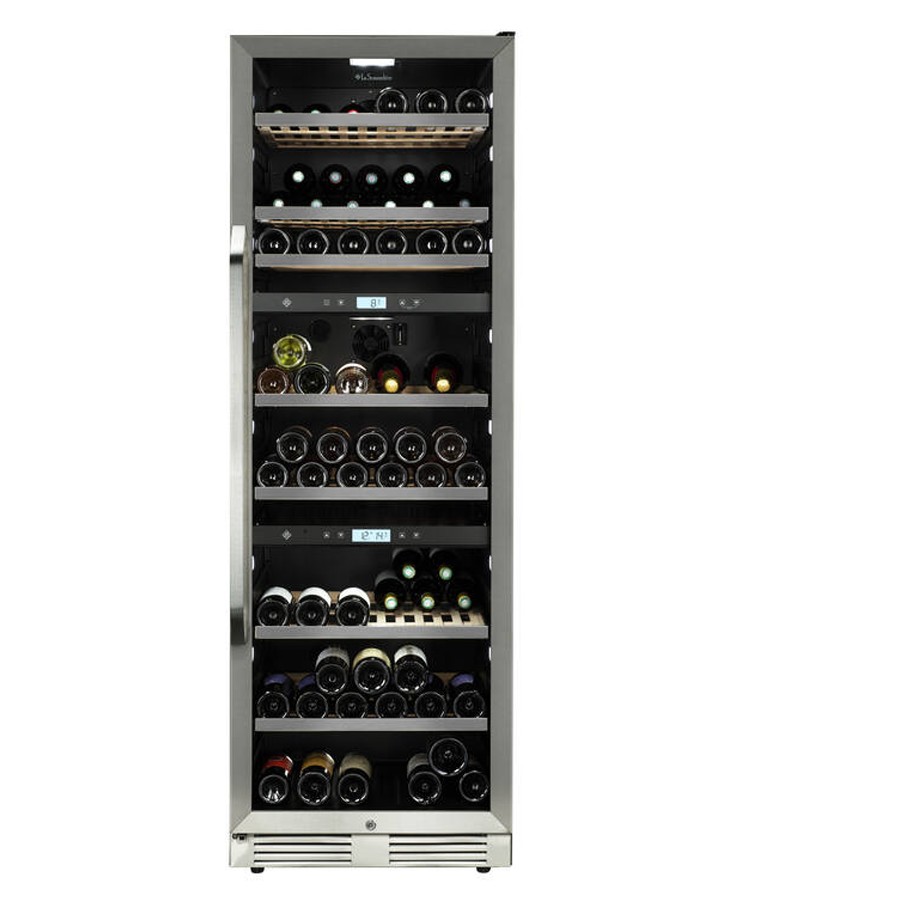 The professional MT145TZ wine cellar offers a capacity of 143 bottles with 3 distinct temperature zones, ideal for storing red wines, white wines, and champagnes under optimal conditions.Its fan-assisted cooling system, 3 active charcoal filters, and anti-vibration system guarantee perfect preservation. The stainless steel glass door and LED lighting elegantly showcase your collection.