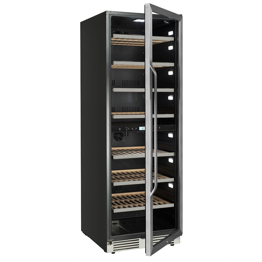 The MT150DZ Wine Cellar is a large, elegant solution for ageing and temperature control, offering storage for up to 152 bottles in its double compartment. With its sleek glass door, white interior LEDs, and stainless steel front, it can be seamlessly integrated into a column or used as a freestanding unit. The cellar features 7 sliding beech shelves, 2 active carbon filters, and a multi-temperature, double-zone system for optimal wine storage.