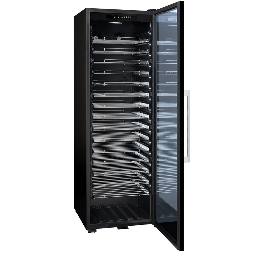 The PRO160N is a professional wine cellar with a 152-bottle capacity, designed for aging and preserving wine. It features a "winter" function, sliding steel shelves, and a quiet operation (37 dB). The cellar includes white LED lighting, a stainless steel door base, and a lock for security. It offers humidity control, audible and visual alerts, and efficient energy usage (180 kWh/year). Its anti-UV glass door allows for optimal wine display. Ideal for professional use, it ensures reliable temperature and humidity management for storing wine in perfect condition.