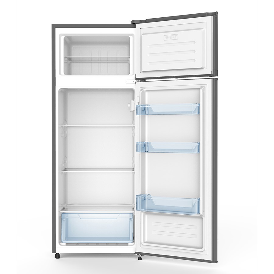 The FrigeluX RDP215NE Fridge-Freezer is a sleek black appliance offering a total capacity of 204 liters to accommodate your refrigeration needs. The refrigerator compartment provides 167 liters of space, featuring two glass shelves, a vegetable drawer, and three door balconies for organized storage. The top-mounted freezer offers 37 liters of space, ideal for your frozen goods. Operating at a quiet 41 dB, this energy-efficient unit ensures optimal performance with an annual energy consumption of 172 kWh. Its compact dimensions (52.5 cm width, 54 cm depth, 143 cm height) make it a perfect fit for various kitchen layouts.