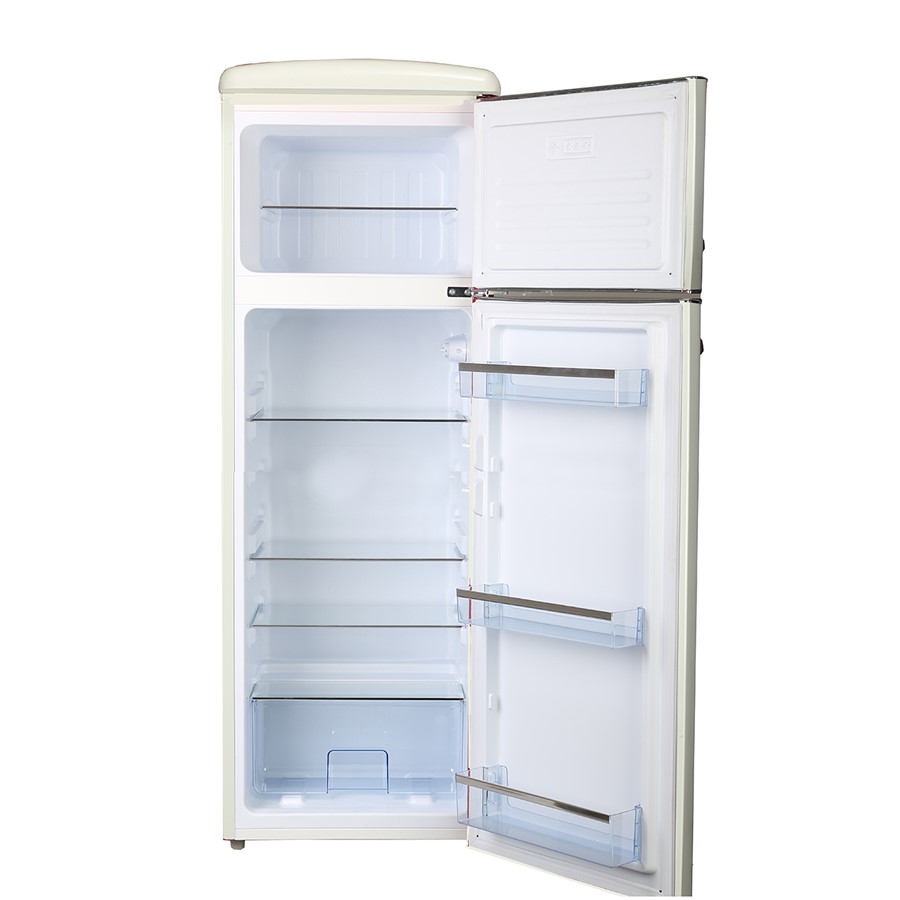 The Frigelux RFDP246RCA++ Top-Mounted Fridge Freezer is a stylish and efficient solution for your kitchen needs. With a total capacity of 246 liters, it offers ample space for your groceries, featuring a 194-liter refrigerator section and a 52-liter freezer compartment. Its cream retro design adds a touch of elegance to any kitchen décor. The appliance operates quietly at 41 dB and includes automatic defrosting for hassle-free maintenance. Energy-efficient and practical, this fridge freezer is the perfect addition to keep your food fresh and organized.