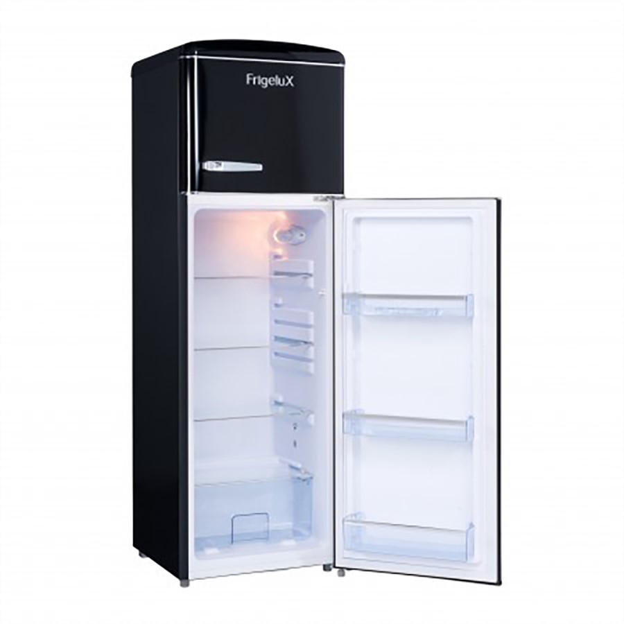The Frigelux RFDP246RNA++ Top-Mounted Fridge Freezer is a stylish and efficient solution for your kitchen needs. With a total capacity of 246 liters, it offers ample space for your groceries, featuring a 194-liter refrigerator section and a 52-liter freezer compartment. Its sleek black retro design adds a touch of elegance to any kitchen décor. The appliance operates quietly at 41 dB and includes automatic defrosting for hassle-free maintenance. Energy-efficient and practical, this fridge freezer is the perfect addition to keep your food fresh and organized.