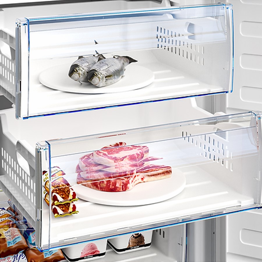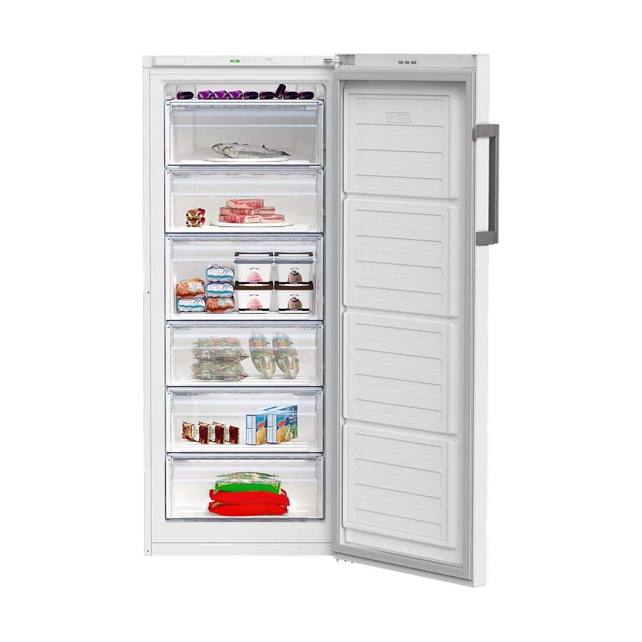 This spacious Beko Larder freezer has a 215-litre capacity, offering ample storage for all your fresh food needs. Inside, the fridge is equipped with bright LED lighting, providing clear visibility of all your stored items. With two shelves and six drawers, it offers plenty of storage, making it an ideal choice for larger households. The freezer also has a reversible door for versatile installation and comes in a sleek white finish.