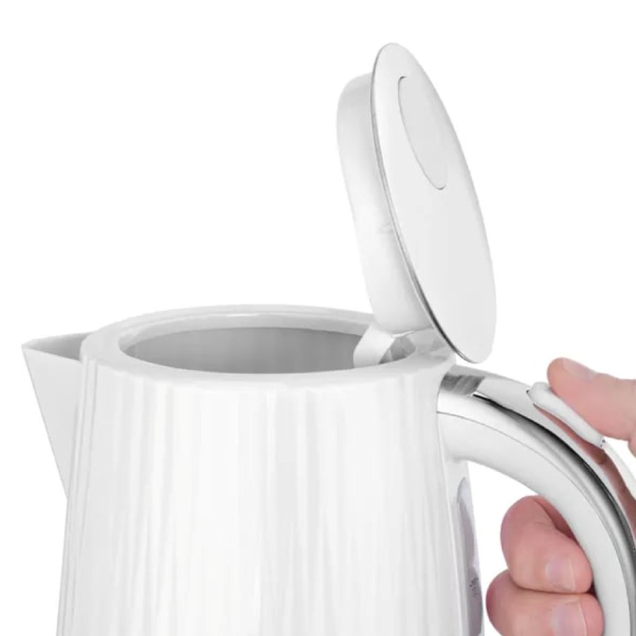 Stylish and efficient, the Russell Hobbs Eden Kettle features a sleek white, grooved design with a discreet water window and gauge for energy-saving boils. Enjoy easy filling and pouring with a push-button lid, perfect pour spout, and 360° base with cord storage. An illuminated power switch and easy-reach controls add extra convenience.