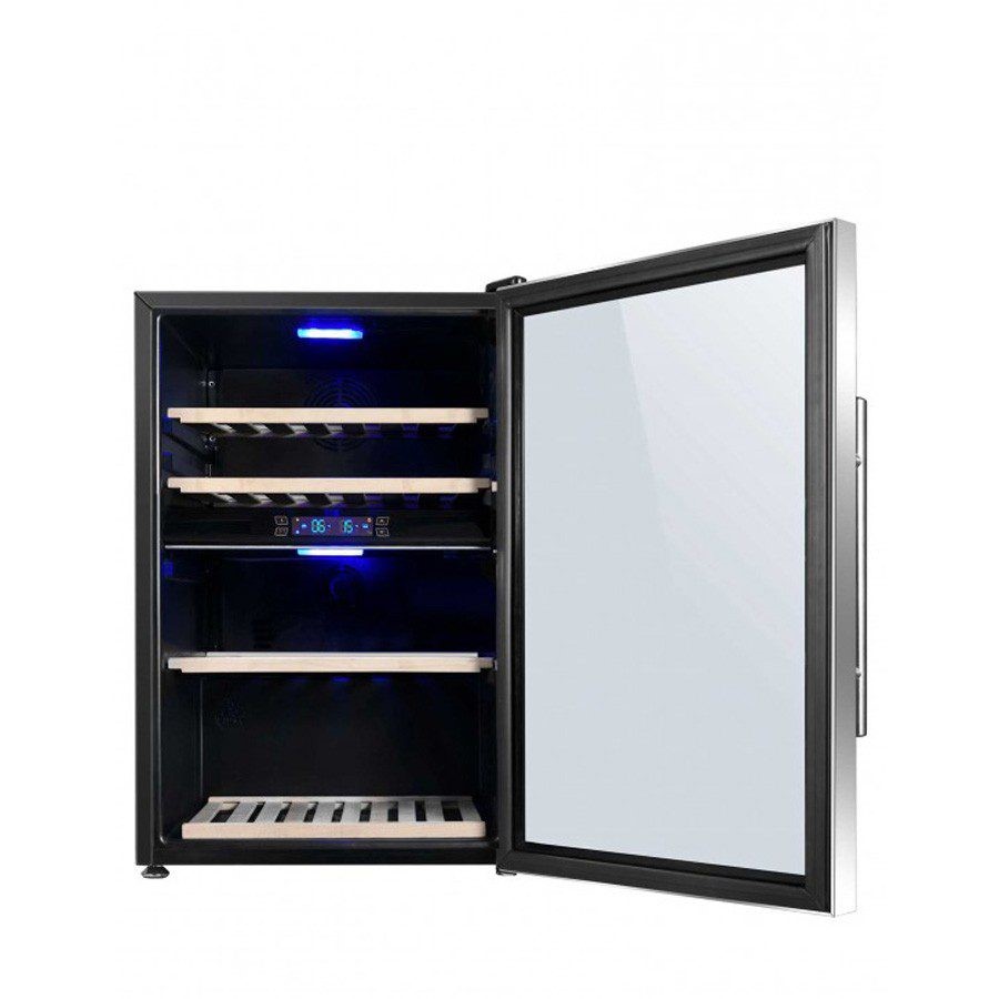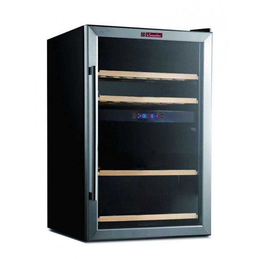 The La Sommelière SLS48.2Z is a dual-zone service wine cellar with a 42-bottle capacity. It features two independently adjustable temperature zones: 5-12°C for the upper zone (23 bottles) and 12-20°C for the lower zone (19 bottles). The cellar has a sleek black body, stainless steel door frame, and anti-UV glass. It includes wooden shelves, a digital thermometer, an anti-vibration system, and a winter function to maintain temperature. The cellar is also designed with natural humidity regulation for optimal wine storage.