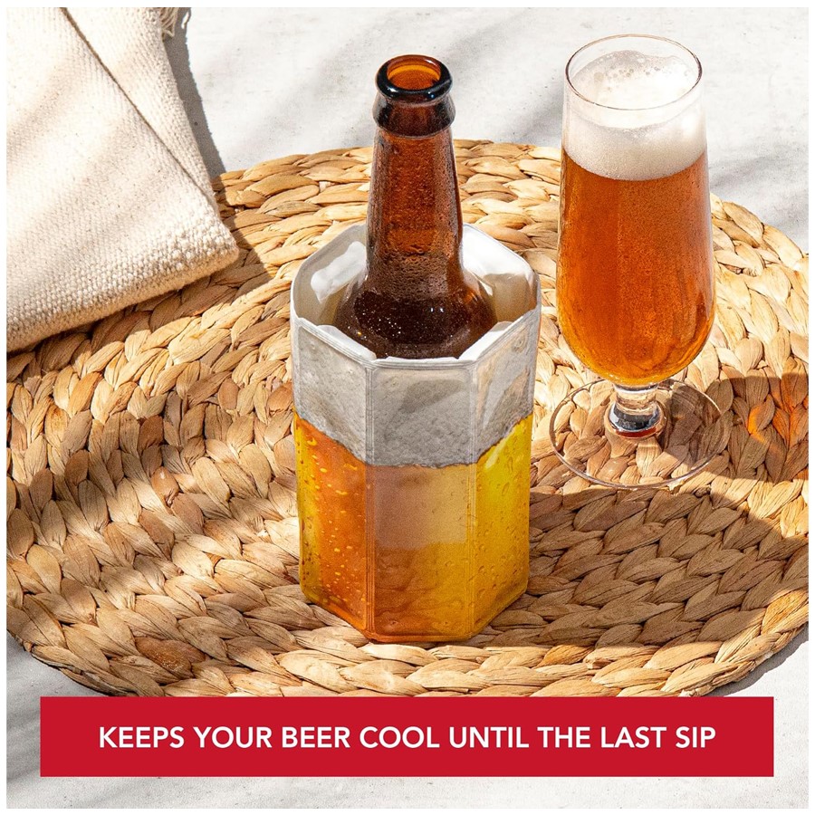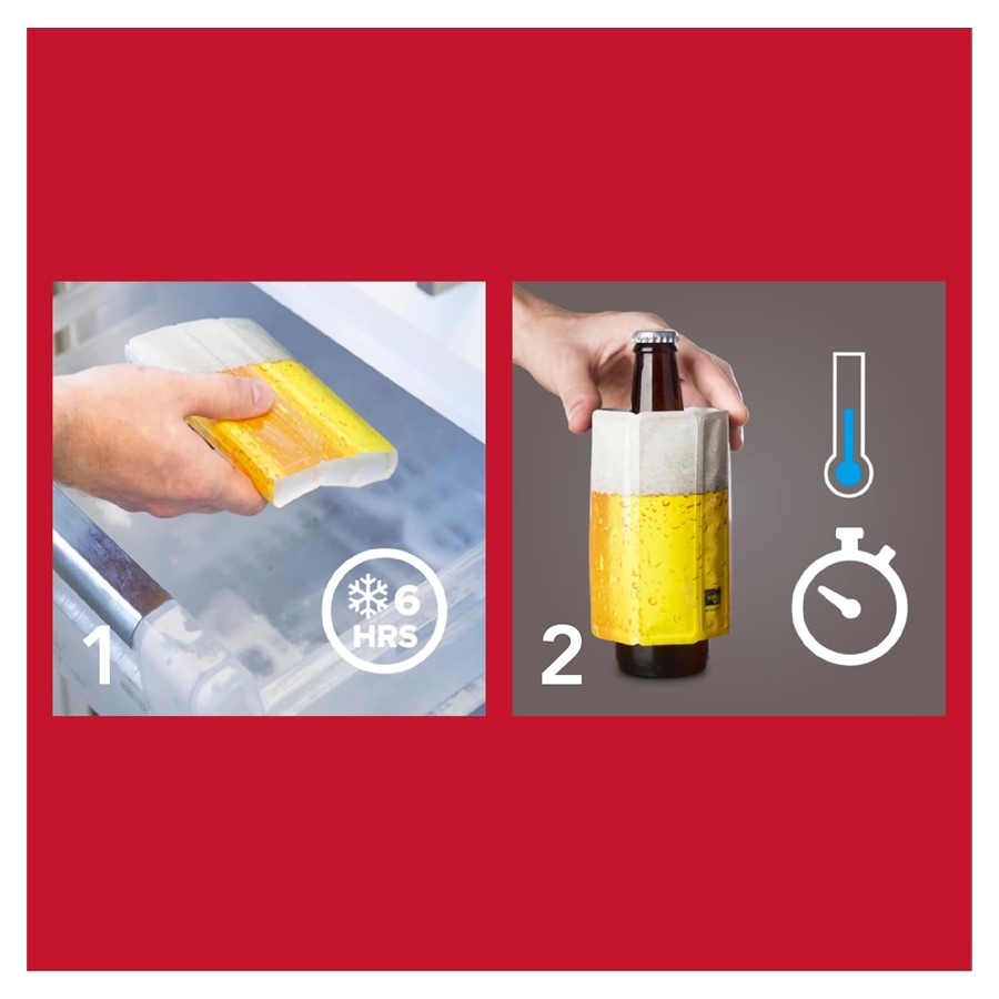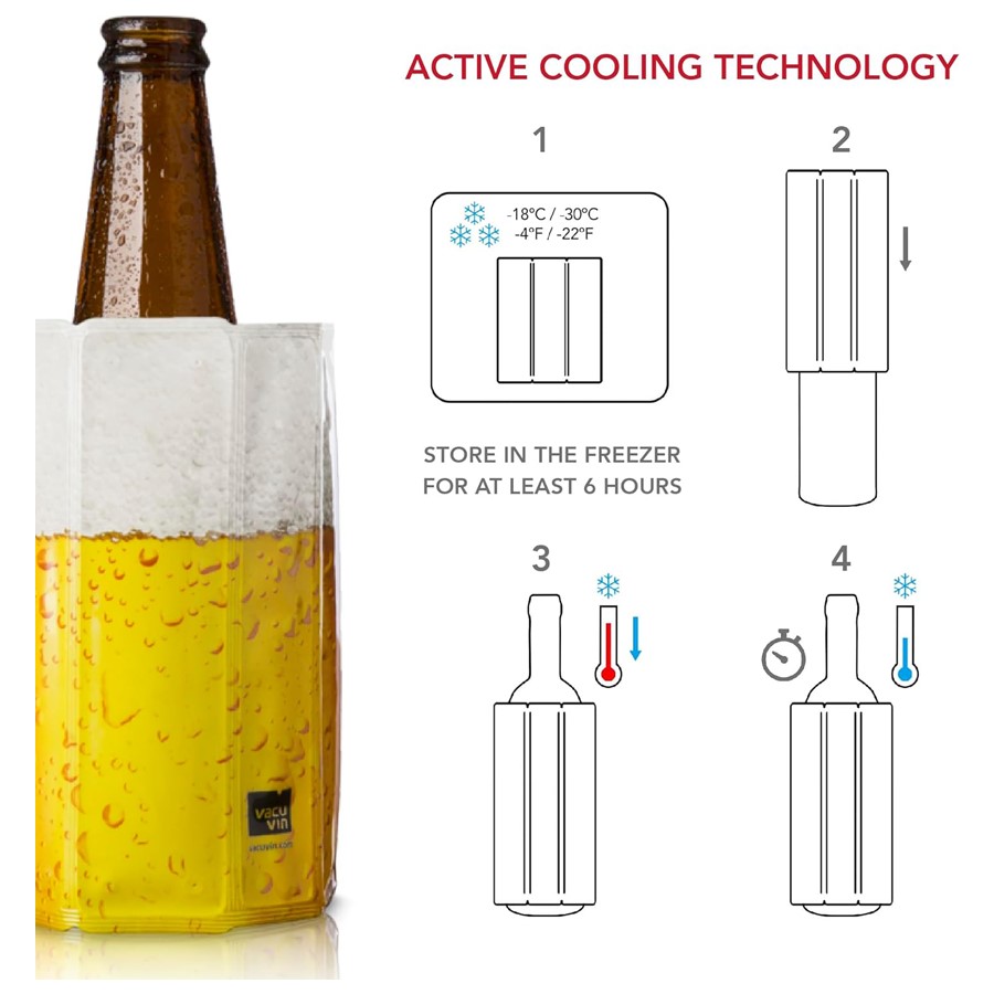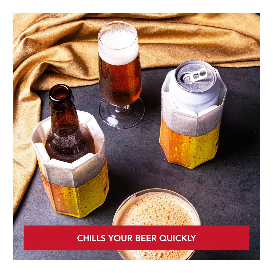 This Vacu Vin Beer Cooler Sleeve is the ultimate solution for keeping your beer perfectly chilled for hours. Designed with six pockets containing special liquid that freezes solid, the sleeve fits snugly over standard-sized glasses to rapidly chill your beer and maintain its cool temperature. Flexible and virtually unbreakable, it’s easy to store in the freezer, and when you're ready to enjoy your drink, simply slip it over your glass for a refreshing experience. With its unique design printed to resemble a foamy glass of beer, it's not only functional but also adds a fun touch to any gathering.