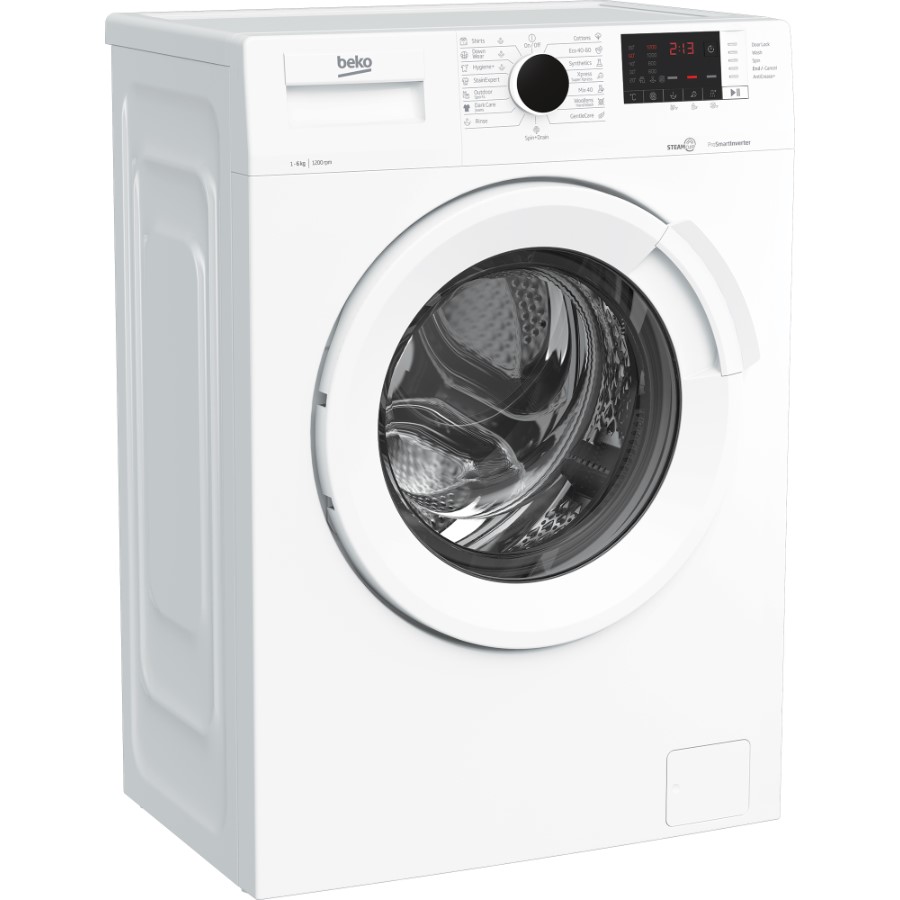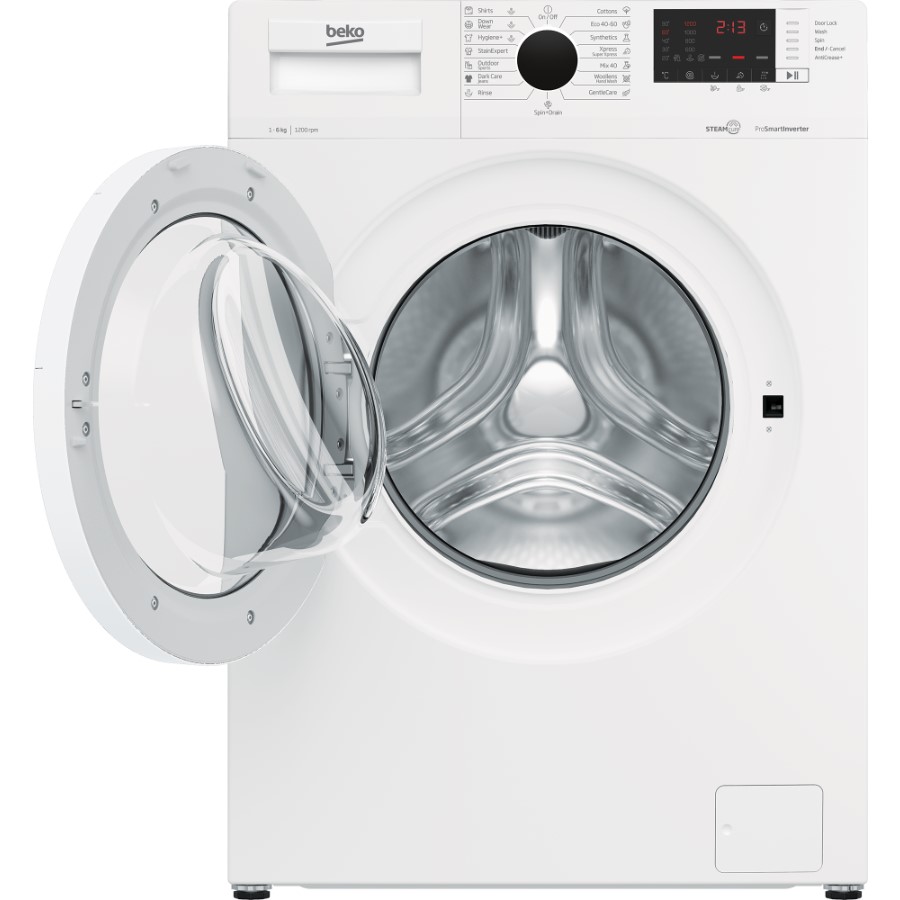The Beko 6kg front-loading washing machine is designed for efficiency and convenience in small to medium-sized households. It features a 1200 RPM spin speed, providing effective water extraction to reduce drying time. This model offers a variety of wash programs, including options for cotton, synthetics, delicates, wool, hand wash, and quick wash cycles, making it versatile for different laundry needs. The machine is energy efficient, helping to save on electricity bills, and includes an easy-to-read LED display with intuitive electronic controls. Additional features such as a time delay function, child lock, and overflow safety enhance its user-friendliness. It incorporates Beko's ProSmart™ Inverter Motor for quieter and more durable operation, and AquaWave® Technology for a gentle washing action that protects clothes. Its sleek and modern design, with dimensions approximately 84 cm in height, 60 cm in width, and 45 cm in depth, makes it a stylish and practical addition to any home laundry setup.